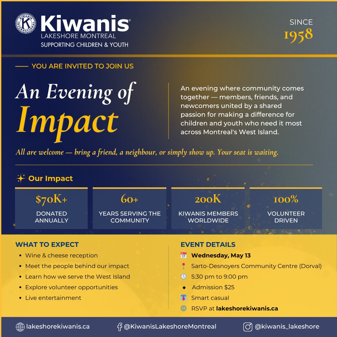 For over 65 years, Kiwanis Lakeshore Montreal has been changing lives across Montreal's West Island. On May 13th, we invite you to be part of that story.